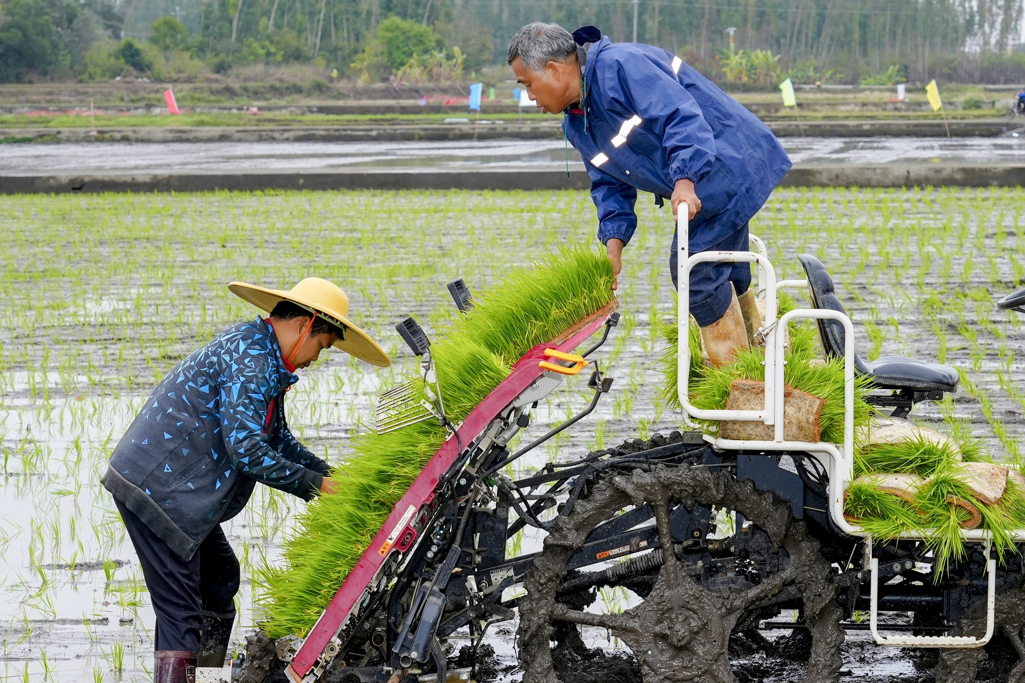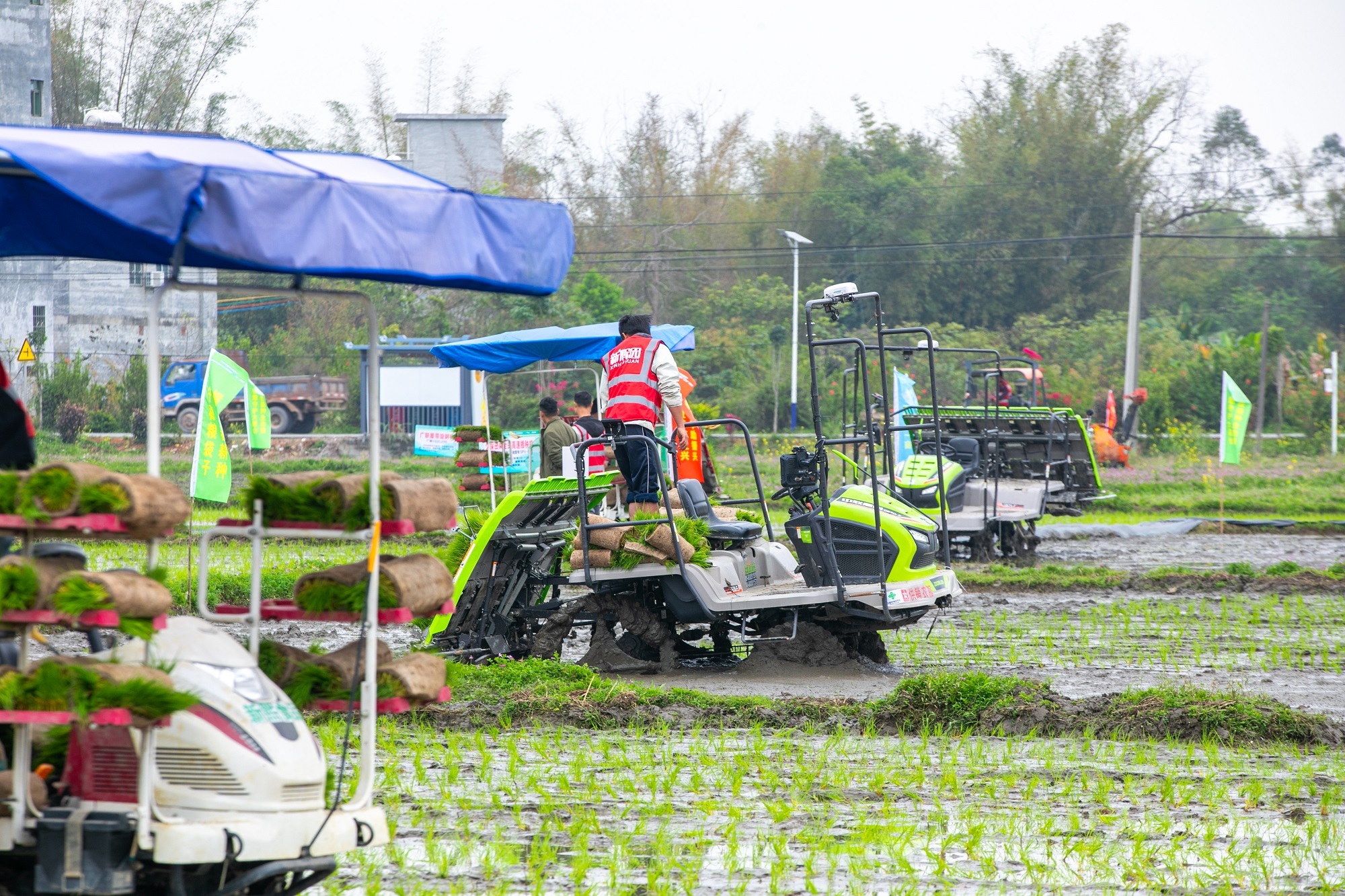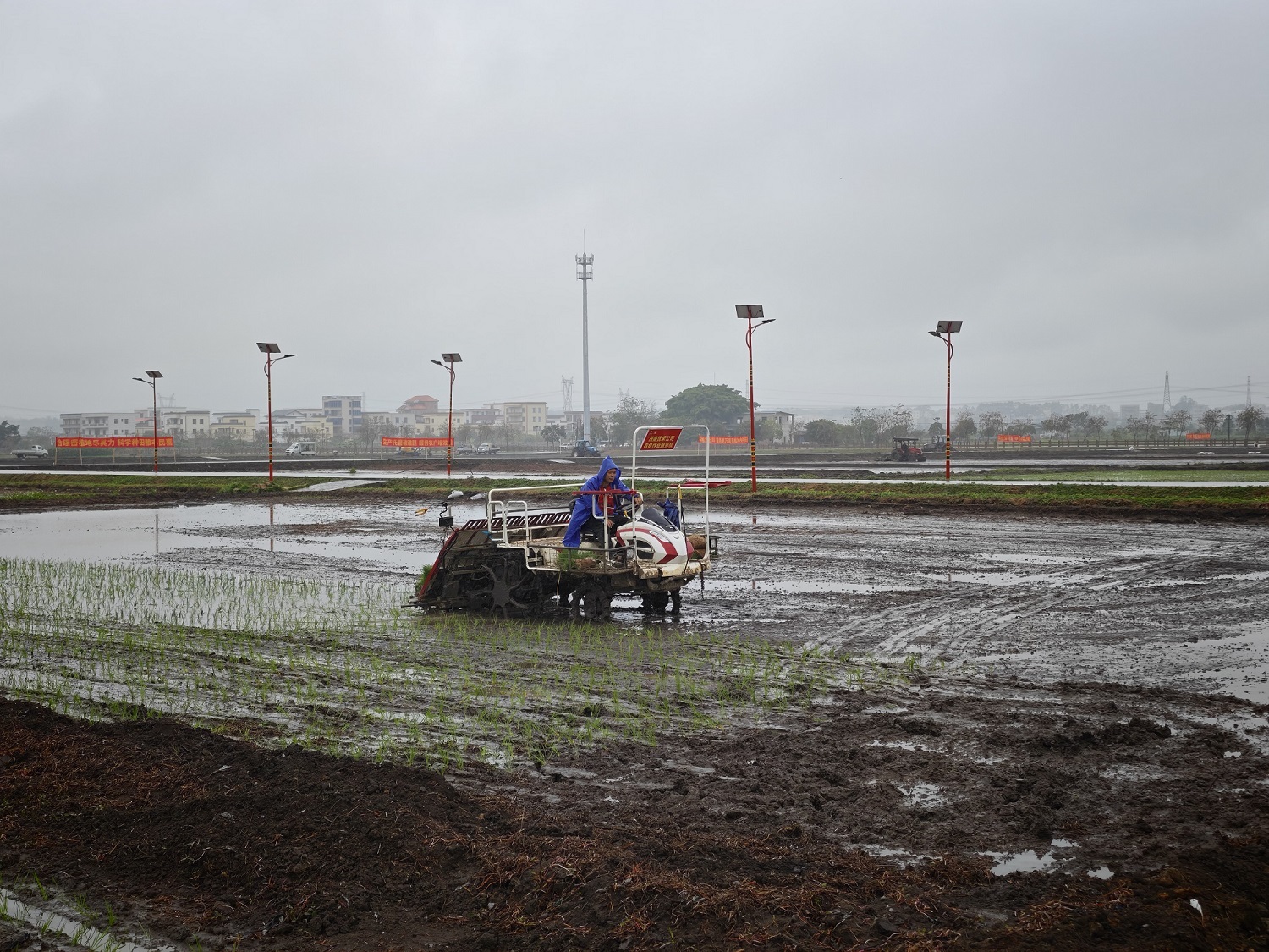 在茂名茂南,春雨贵如油,技艺东谈主员在冒雨在田中演示高速插秧机功课过程。