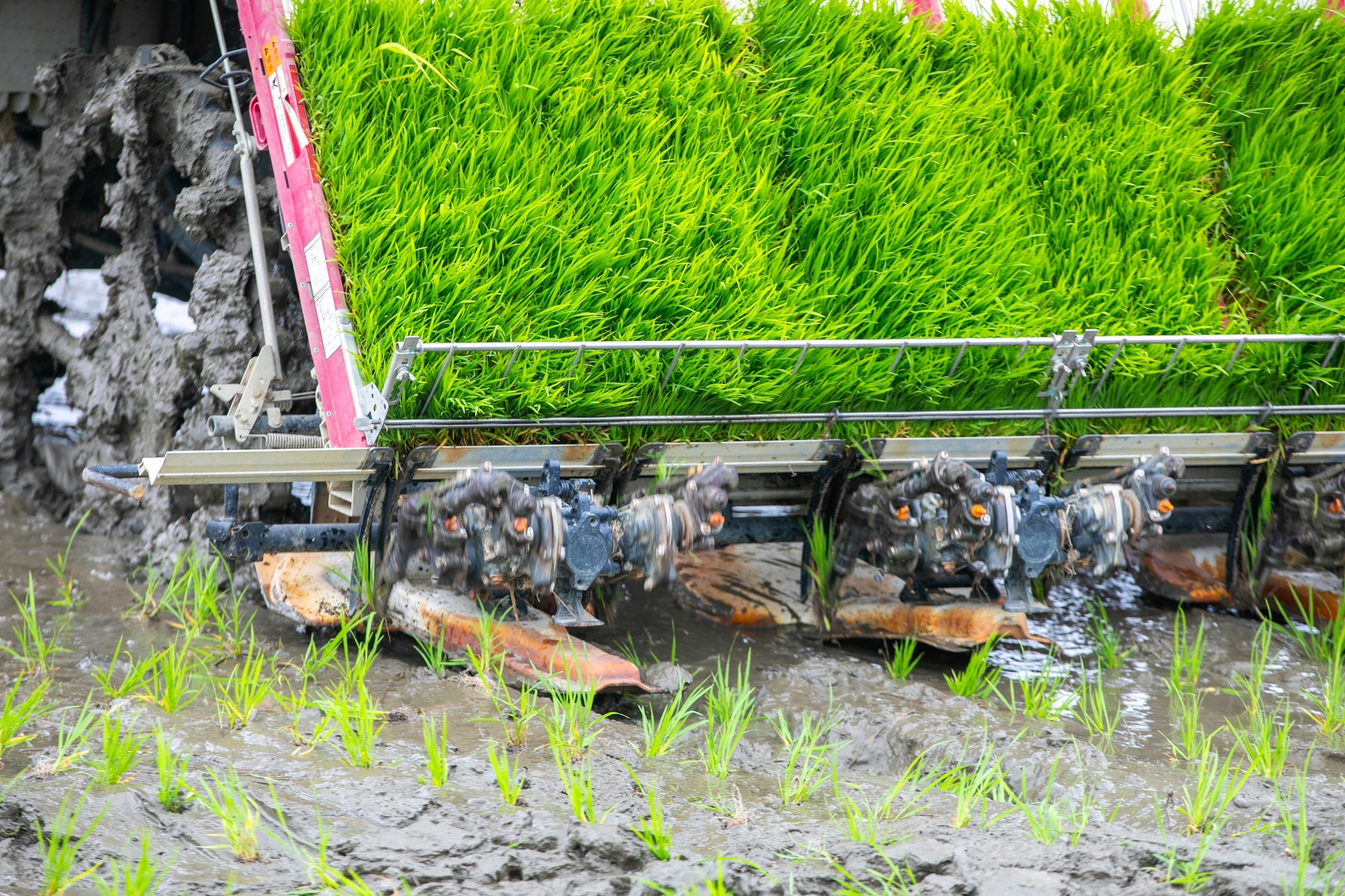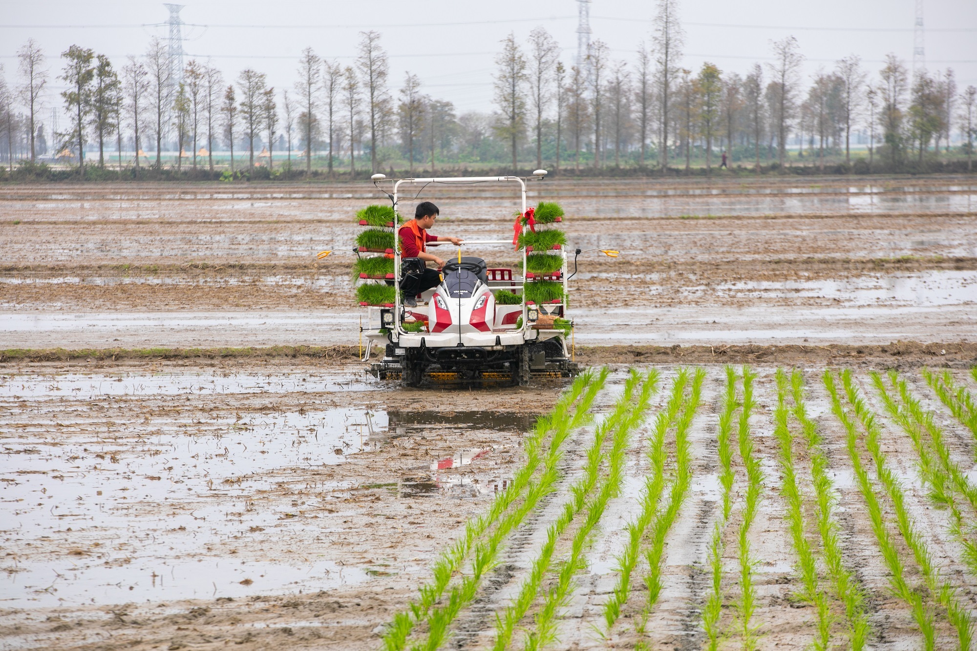 高速水稻插秧机将秧苗整皆连忙地种入地盘。