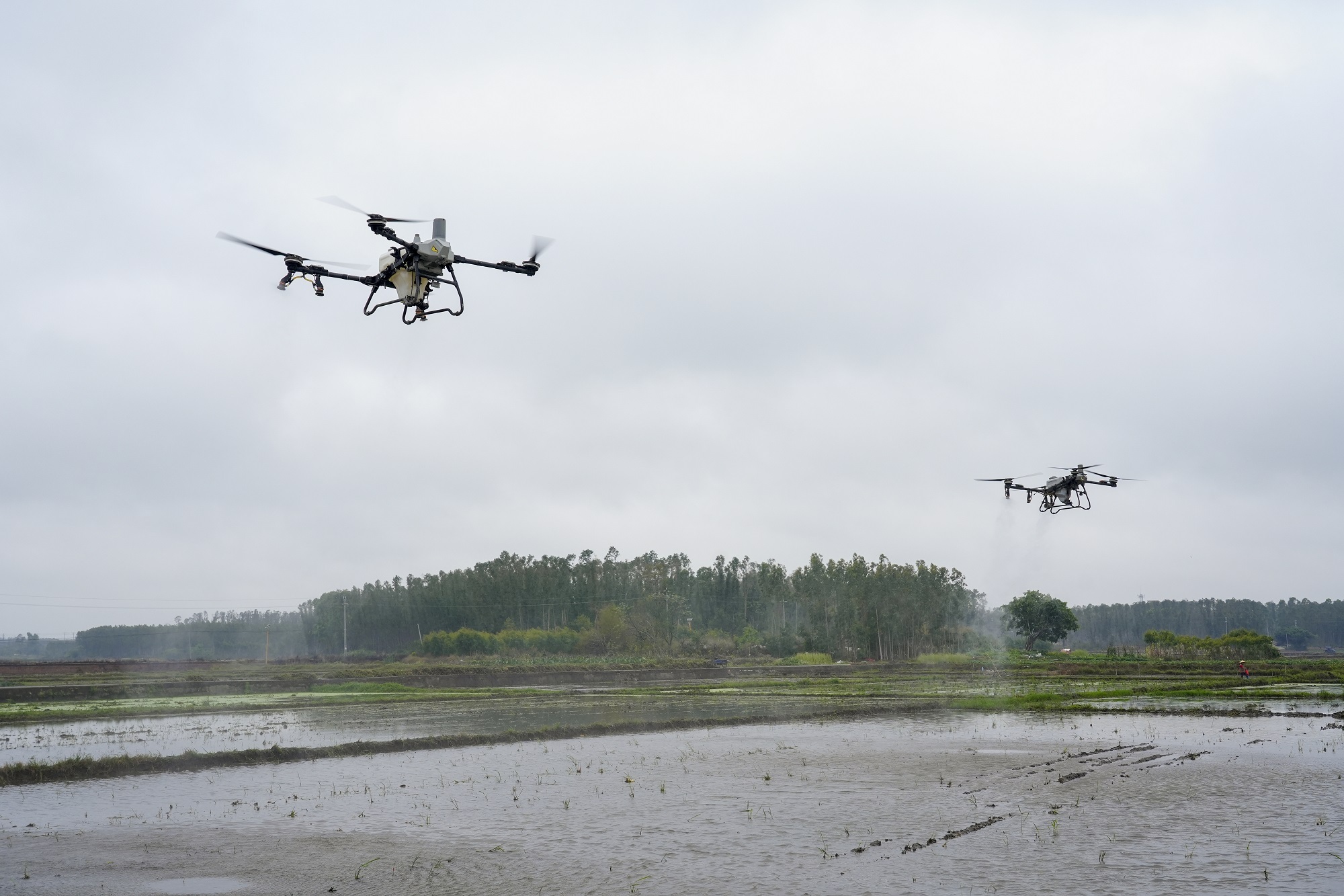 在湛江春耕会,植保无东谈主机演示施肥过程。