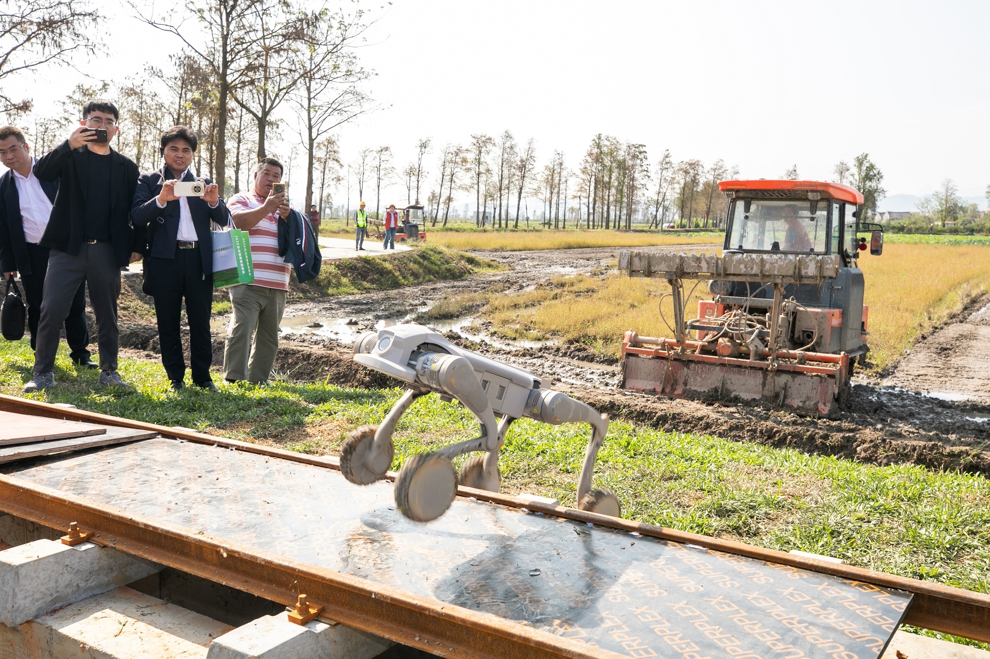 在江门台山,专为当代农业巡检研发的智能四足机器东谈主亮相。