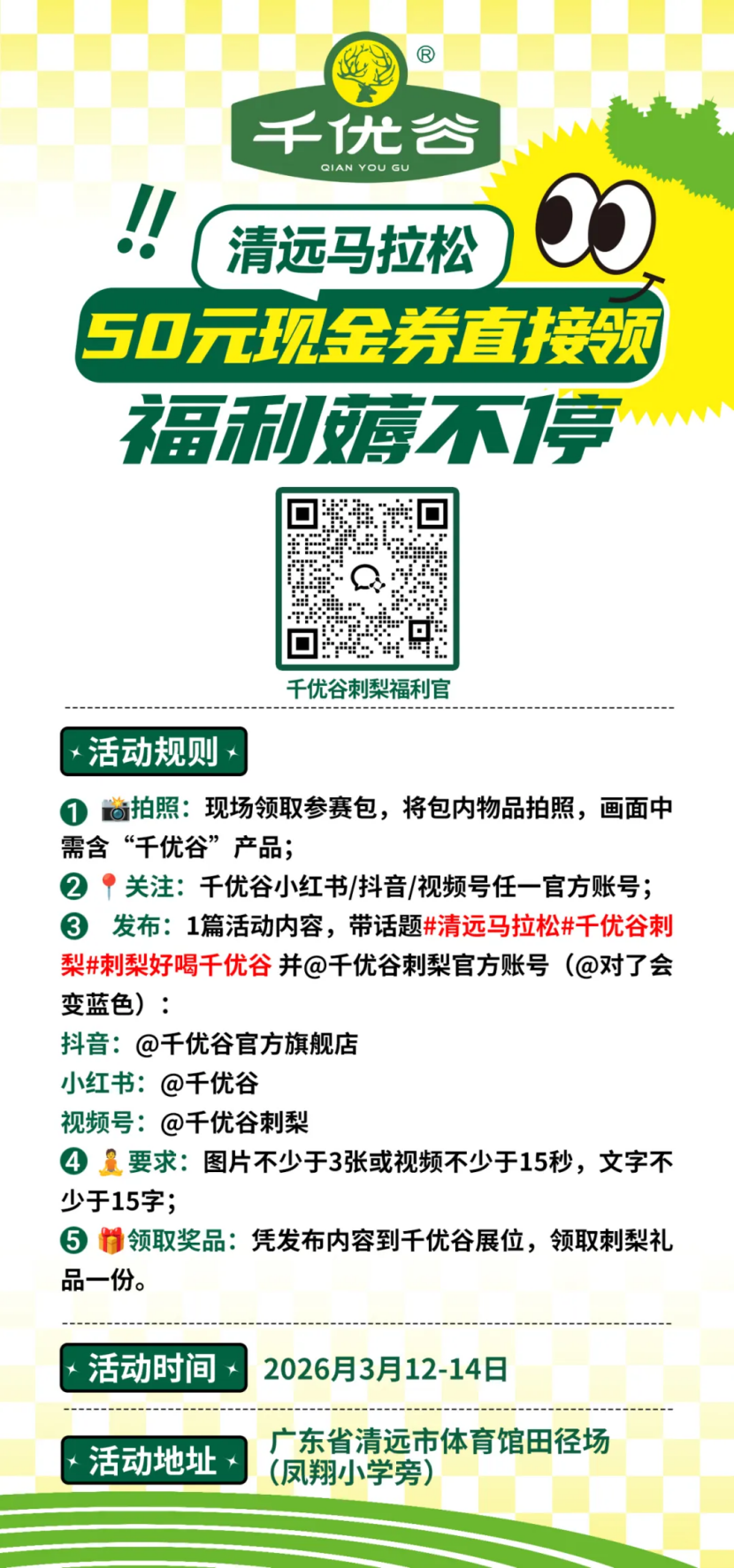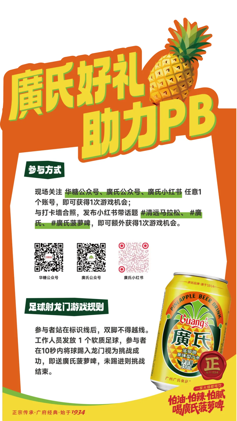 与打卡墙合照,发布小红书带话题 #清远马拉松、 #廣氏、 #廣氏菠萝啤,即可稀罕取得1次游戏契机。