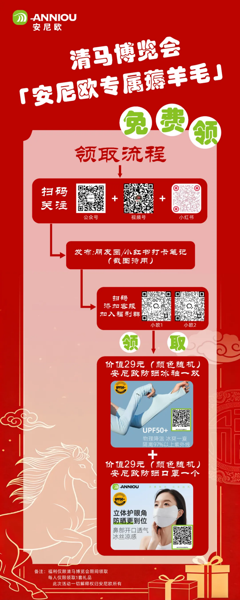 扫码怜惜“公众号+视频号+小红书”,发布一又友圈/小红书打卡札记,扫码添加客服加入福利群,即可领取价值29元的安尼欧防晒冰袖一对或安尼欧防晒口罩一个。