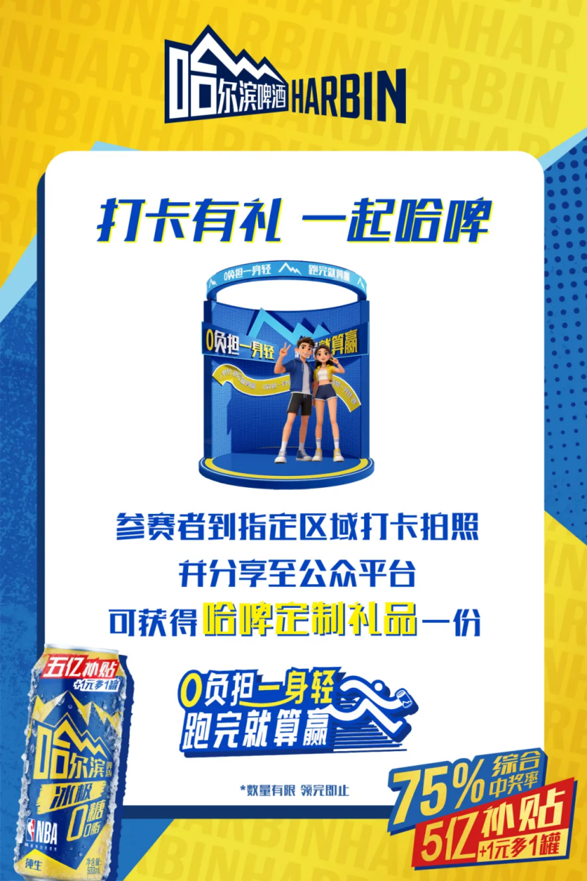 参赛者到哈尔滨展位指定区域拍照并共享至公众号平台,可取得哈啤定制礼品一份。(温馨指示:赛前24小时请勿喝酒)