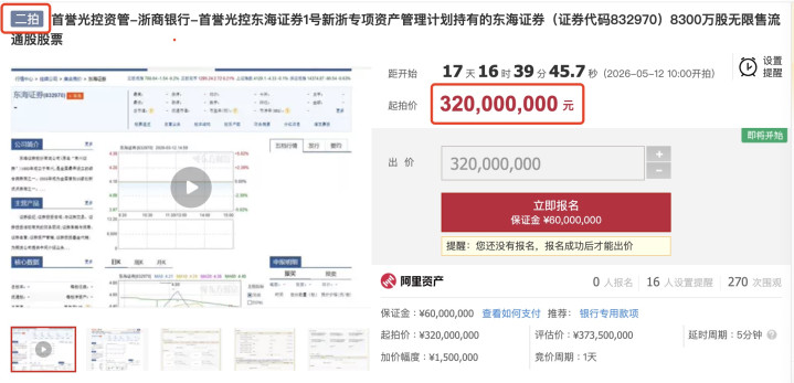今夜之间,起拍价从3.735亿元下调到了3.2亿元,东海证券(832970.NQ)流拍的8300万股股权二次上架,再觅买主。