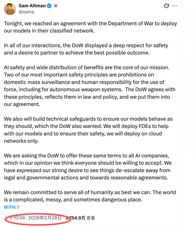 全文很长,既包含对OpenAI和DoW配合的具体阵势的分析,也包含对奥特曼的径直错误。