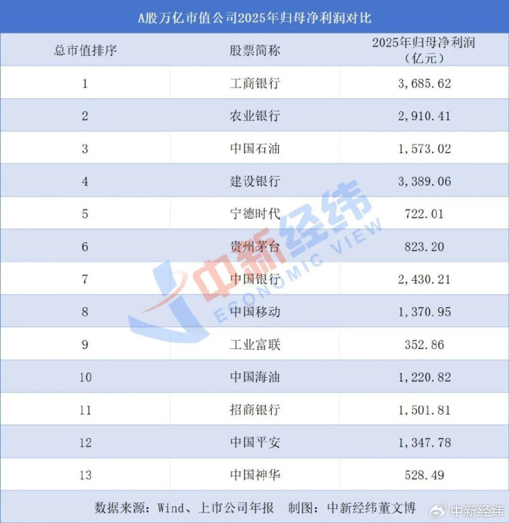 对比来看,Wind数据走漏,限度23日收盘,A股总市值超万亿元上市公司共计有13家,归母净利润居于首位的是工商银行,2025年约3685.62亿元;最少的是工业富联,约352.86亿元。