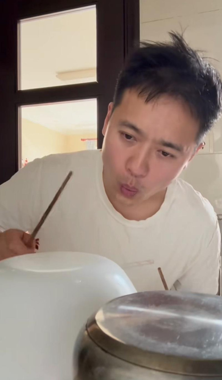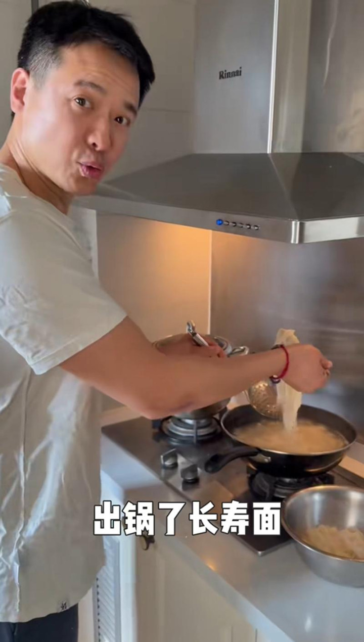 高云翔身穿白色短袖上衣,素颜出镜,亲自在家为父亲煮生日长寿面。