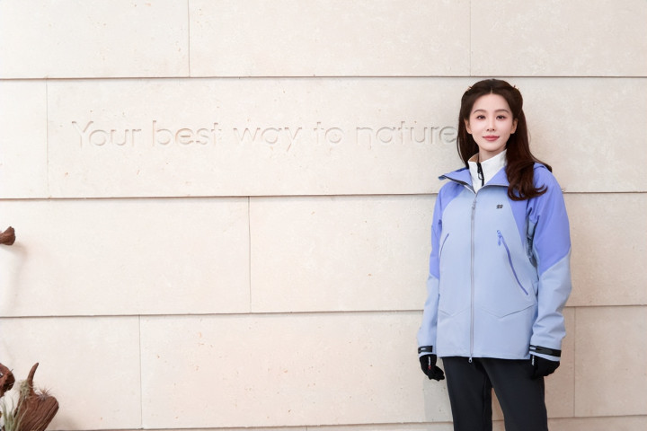 上身的冲锋衣采用了渐变式拼色设计,上半部分为柔和的薰衣草紫,下半部分过渡到低饱和度的浅灰蓝,整体色调清新却不浮夸,既保留了户外服饰的功能属性,又摆脱了传统运动装的“硬核感”。在裁剪上,挺括但不过于宽松,肩线自然贴合,袖口和下摆有轻微收束设计,避免“臃肿感”。同时长度适中,刚好盖过臀部,搭配高腰裤能很好地修饰比例。