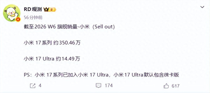 2月25日,博主“RD不雅测”清楚,摈弃2026年第6周,小米17系列总销量已逾越350.46万台,其中小米17 Ultra销量约为14.49万部。
