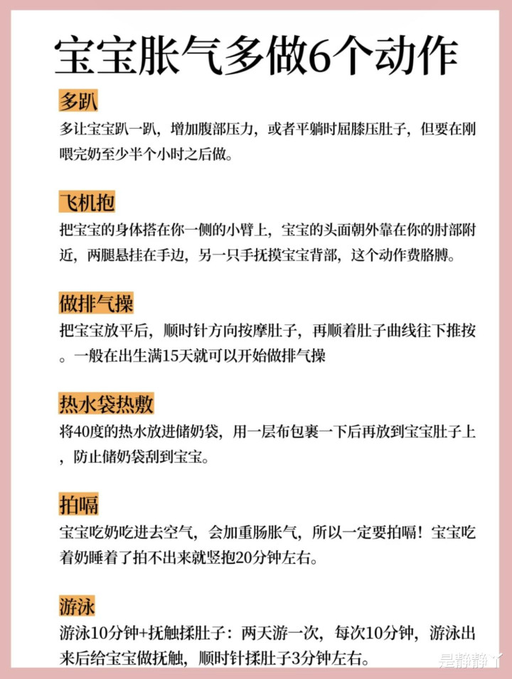 拍嗝亦然缓解胀气的蹙迫法子。宝宝吃奶时容易吞入空气,加剧肠胀气,是以每次喂奶后王人要难忘拍嗝。如果宝宝吃着奶睡着了,拍不出嗝,可以竖抱20分钟附近,匡助气体排出。此外,合适让宝宝游水也有助于缓解胀气。可以两天带宝宝游一次,每次10分钟附近,游水后给宝宝作念抚触,顺时针揉肚子3分钟,为止会更好。
