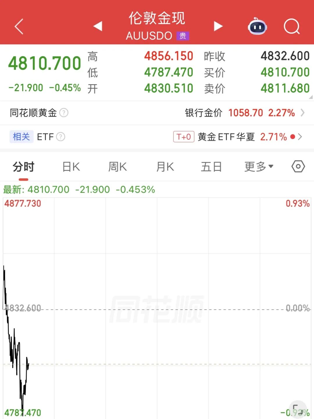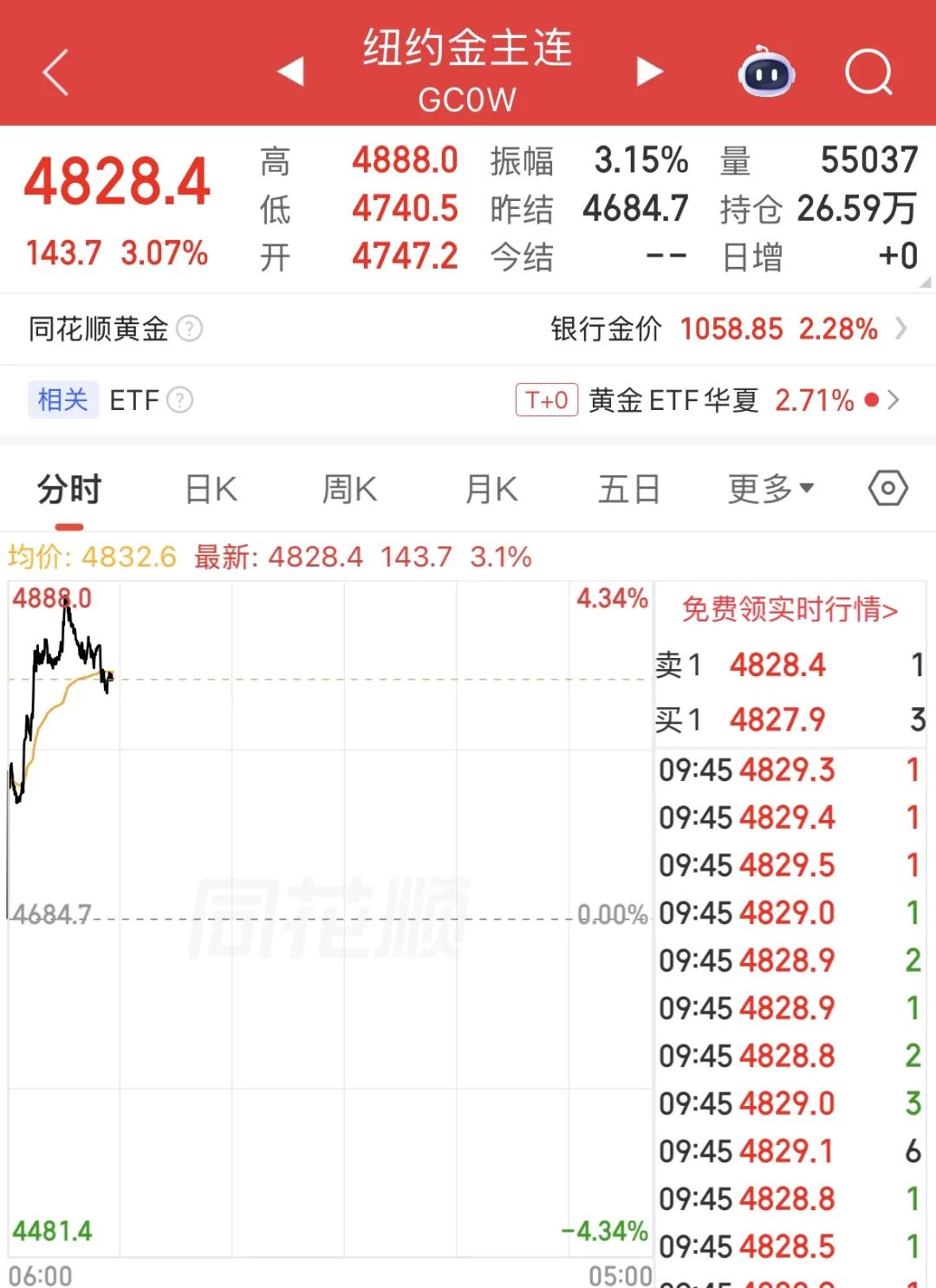 4月8日早盘,海外金价大幅高开,重回4800好意思元关隘。摈弃上昼10时,海外黄金期货涨超3%,报4828.4好意思元/盎司;现货黄金跌0.45%,米兰体彩下载报4810.7好意思元/盎司。