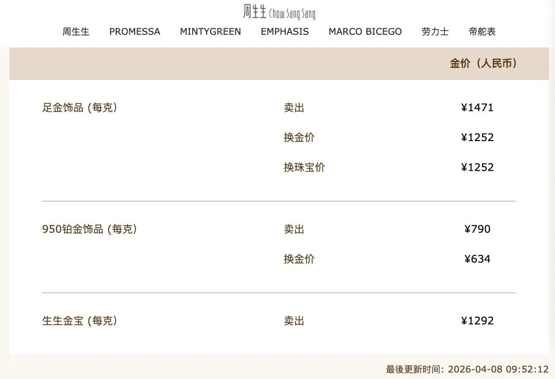 周生生足金饰品价钱由1434元/克上调至1471元/克,高涨37元。